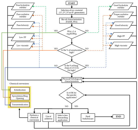 To achieve these goals, it is necessary to review the minimum requirements for lubricants, the advantages and disadvantages of natural sources, and the existing techniques for improving these materials to produce potential alternatives to petroleum-based lubricants. The basic functions of lubricants can be summarized as follows: (a) to reduce energy losses; (b) to protect surfaces from wear due to friction; (c) to protect against corrosion; (d) to reduce oxidation effects; (e) to cool down surfaces; (f) to decrease heat losses due to contact between moving surfaces; or (g) to increase tightness and prevent the leakage of contaminants and sediments [,], in addition to certain requirements depending on the application.