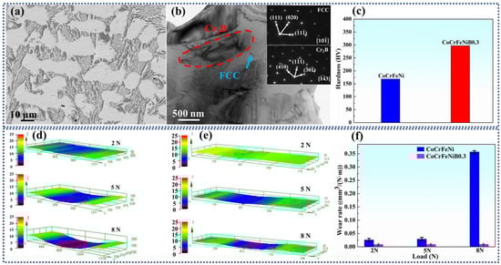 (a) Backscattered electron images of CoCrFeNiB0.3 HEA; (b) bright-field images of CoCrFeNiB0.3 HEA with SAED pattern; (c) Vickers hardness of CoCrFeNi and CoCrFeNiB0.3 HEAs; (d) 3D profiles of the worn surfaces of CoCrFeNi HEA under different loads; (e) 3D profiles of the worn surfaces of CoCrFeNiB0.3 HEA under different loads; (f) wear rates of CoCrFeNi and CoCrFeNiB0.3 HEAs under different loads.