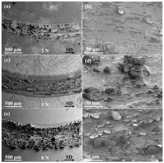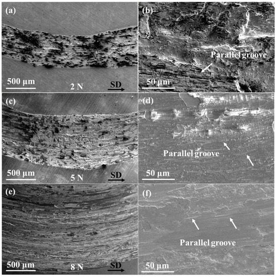 Figure 2 shows the wear scars of CoCrFeNi HEA under different loads. As shown in Figure 2a,c,e, the width of the wear scar increased with the load. The wear behavior was typical of abrasive wear []. A large number of grooves appeared on the worn surfaces, which were caused by the hard, rough surface sliding across the softer surfaces, as shown in Figure 2b,d,f. Moreover, the number and depth of grooves increased with the increase in load, indicating an increase in the wear rate of the alloy.