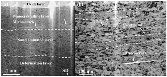 The worn subsurface structures of the alloys were further analyzed to reveal the origin of the large difference in wear rates between CoCrFeNi and CoCrFeNiB0.3 HEAs under the 8 N load. Figure 4 shows the sliding wear-induced ND–SD cross-sectional subsurface structure of the CoCrFeNi HEA under the 8 N load. The subsurface layer consisted of oxide, equiaxed nanocrystalline, nanolaminated, and deformation layers, which was consistent with previous studies []. Additionally, previous research results showed that the formation of shear bands was the main reason for the sharp increase in the wear rate under higher loads []. A large number of shear bands were also formed in the nanocrystalline layer of CoCrFeNi HEA, as shown in Figure 4b, which should be mainly caused by severe damage from deformation twins under higher loads. This indicated that localized deformation occurred in the form of shear bands during stress concentration. Nucleation and growth of cracks often occurred in the shear bands, which directly led to high wear rates.