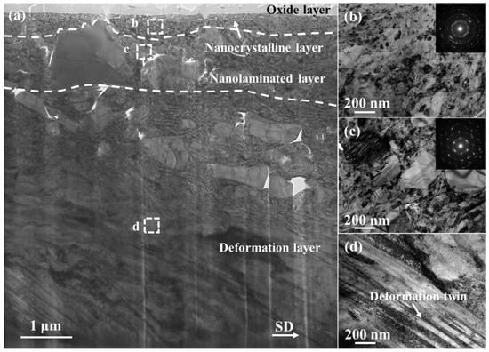 Figure 5 shows the sliding wear-induced ND–SD cross-sectional subsurface structure of the CoCrFeNiB0.3 HEA under the 2 N load. The subsurface layer consisting of oxide, equiaxed nanocrystalline, nanolaminated, and deformation layers was formed in the CoCrFeNiB0.3 HEA. The average thickness of the nanocrystalline layer was 0.5 μm. As shown in Figure 5b and the inset, the grain size was 50 nm. The nanocrystalline layer was followed by a nanolaminated layer with a thickness of 1 μm and a grain size of ~50 to 200 nm, which was elongated along the sliding direction. The remaining part was the deformation layer, where the deformation twins were formed, as shown in Figure 5d.