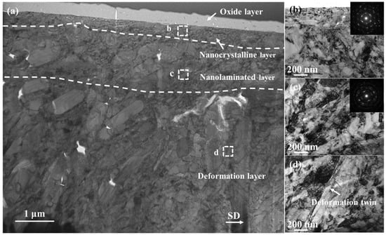 Figure 6 shows the sliding wear-induced ND–SD cross-sectional subsurface structure of the CoCrFeNiB0.3 HEA under the 5 N load. The composition of the subsurface structure under the 5 N load was the same as that under the 2 N load. The increase in load had an obvious influence on the thickness of the subsurface structure. Beneath the oxide layer was the nanocrystalline layer with an average thickness of 0.5 μm. As shown in Figure 6b and the inset, the grain size was ~50 nm. The nanocrystalline layer was followed by a nanolaminated layer, with a thickness of 1 μm and a grain size of ~200 to 300 nm, which was elongated along the sliding direction. The remaining part was the deformation layer with the deformation twins, as shown in Figure 6d.