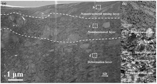 Sliding wear-induced ND–SD cross-sectional subsurface structure of the CoCrFeNiB0.3 HEA under the 2 N load: (a) bright-field TEM (BFTEM) image and (b–d) high-magnification images of selected regions in (a).