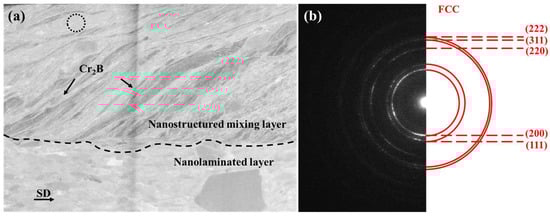 Figure 8a The gray part in the nanostructured mixing layer was Cr2B and streamlined along the sliding direction. According to the SAED pattern in Figure 8b, the matrix of the nanostructured mixing layer was still in the FCC phase. During the process of friction and wear, Cr2B was fragmented and its size significantly reduced. With the crushing of Cr2B, a crack area appeared in the subsurface layer, and its strength was lower than that of the surrounding materials, which led to a huge shear instability, resulting in a turbulent plastic flow in the subsurface layer []. Venkataraman et al. found that for Al alloy, besides the shear instability caused by loads, the reinforcing particles were also a necessary condition for the formation of the nanostructured mixing layer. Therefore, the combination of shear instability and the hard formation of Cr2B resulted in a nanostructured mixing layer [,]. Moreover, the hardness of this nanostructured mixing layer was significantly higher than that of the matrix, which obviously improved the wear resistance of the material [].