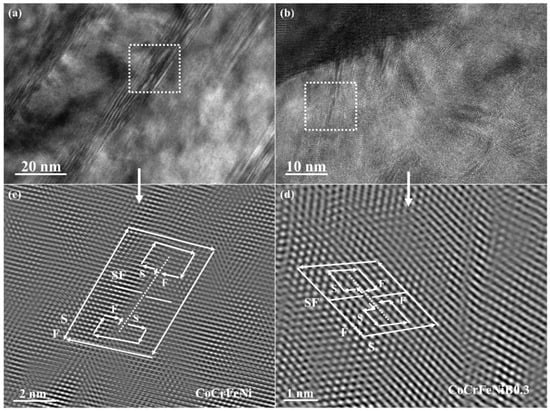 HRTEM image and the corresponding inverse fast Fourier transform (IFFT) image with Burgers circuits surrounding the entire stacking fault (SF): (a,c) CoCrFeNi HEA; (b,d) CoCrFeNiB0.3 HEA.