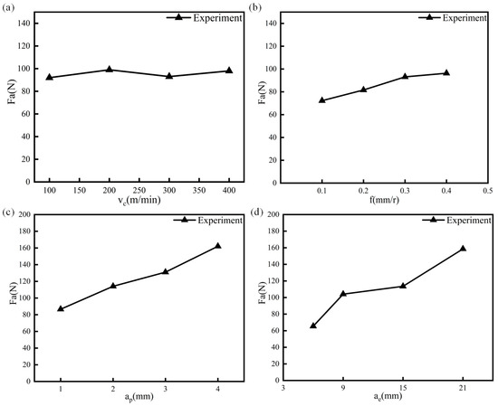 The axial cutting force was recorded by the KISTLER four-component dynamometer. Figure 2 shows the variation trend of the axial cutting force with cutting speed, feed rate per tooth, axial cutting depth, and radial cutting depth. The axial milling force increases with the increase in cutting speed, feed rate, axial cutting depth, and radial cutting depth.