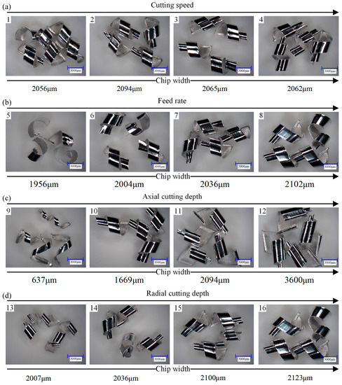 The influence of the radial cutting depth, axial cutting depth, feed volume, and cutting speed on the chip is successively reduced. The ZL205A aluminum alloy will generate continuous chips under the cutting parameters of the test design. Even if the cutting speed increases, the macroscopic change in the chips is not obvious (Figure 3a). Increasing the feed (Figure 3b) and cutting depth (Figure 3c,d) will increase the cutting speed in the unit and the removal amount. As a result, the extension length of the chip in the cutting area increases so the chip length becomes longer, and the length deformation coefficient lessens (Figure 3b). When the axial cutting depth increases, it causes greater cutting force and cutting heat, which will affect the cutting force distribution and chip formation mode in the cutting area.