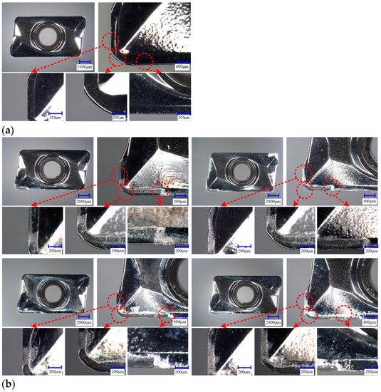Figure 4 shows tool wear. The new blade (Figure 4a) is compared with the blade used in the milling test (Figure 4b). The four blades are all stable.