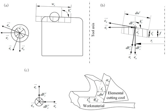 Illustration of (a) the resultant component of the milling force acting on the milling cutter; (b) the elemental component of the milling force acting on the cutting edge; and (c) shows the right-angle cutting corresponding to each micro-element.