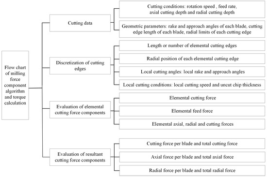 The analysis steps of calculating the milling force component of the milling ZL205A aluminum alloy are shown in Figure 6. First, design the cutting parameters and tool structure required for the test. Secondly, to micro-localize the cutting edge, it is necessary to understand the length of the cutting edge, the cutting position of each micro-element, the local cutting angle, and the local cutting conditions. Then, the axial force, tangent force, and radial force of each microfilm are calculated. Finally, the axial force, tangent force, and radial force, as well as the total axial force, tangent force, and radial force of each blade are predicted, respectively.