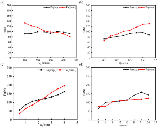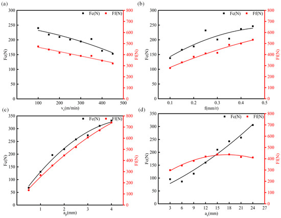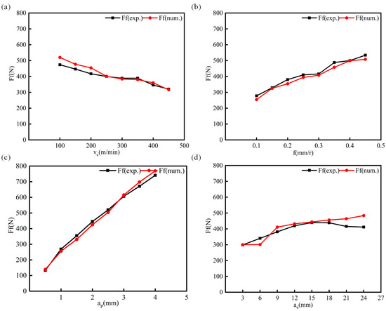 Figure 7b shows the change in tangential force and radial force with the feed. Figure 7c shows the change in tangential force and radial force with axial cutting depth. Figure 7d shows the change in tangential force and radial force with the radial cutting depth. Both the tangential force and the radial force increase with the increase in the cutting parameters, but the degree of influence varies. For the tangential force, the impact of the axial cutting depth, radial cutting depth, and feed is reduced in turn. For the radial force, the impact of the axial cutting depth, feed, and radial cutting depth is reduced in turn. The increase in the cutting depth and feed directly increases the cutting area, thus increasing the deformation resistance, so the cutting force also increases. However, the increase in the feed volume also proportionally increases the cutting thickness. The increase in the cutting thickness reduces the deformation coefficient and the friction coefficient, thus reducing the cutting force. As a result of the positive and negative effects, the cutting force increases with the increase in the feed, but the impact of the feed on the cutting force is less than the impact of the cutting depth on the cutting force. The correctness of this conclusion is also verified by the test and prediction results.