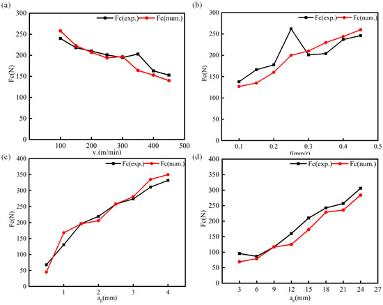 Orthogonal milling: experimental and predicted tangential. (a) The change in the tangential force of milling with the cutting speed. (b) The change in the tangential force of milling with the feed of each tooth. (c) The change in milling tangential force with axial cutting depth. (d) The change in milling tangential force with radial cutting depth.