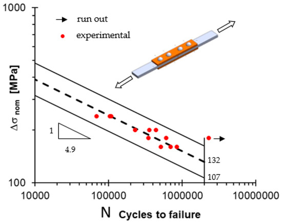 The fatigue strength values analysed under the hypothesis of the log-normal distribution of the number of cycles to failure are shown in Figure 3, where the fatigue strength value at 2 × 106 cycles and the exponent k of the Wöhler curve are also reported.