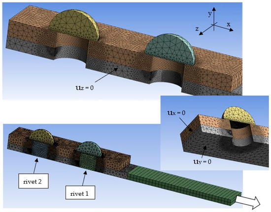 - Vivio, F. A new theoretical approach for structural modelling of riveted and spot welded multi-spot structures. Int. J. Solids Struct. 2009, 46, 4006–4024. [Google Scholar] [CrossRef]