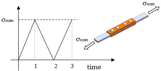 The first analysis considers a linear elastic material. For this reason, the nominal stress in the gross section was considered to be 90 MPa. This value imposes a nominal stress in the net section of 135 MPa close to the fatigue strength Δσnom,50% of the joints at 2 × 106 cycles. As reported in Figure 5, the time history simulates the fatigue of the first two cycles: the first loading and unloading as well as the second loading. The stress was analysed at the second loading (time 3), and the stress range was evaluated between the second loading and the following unloading.