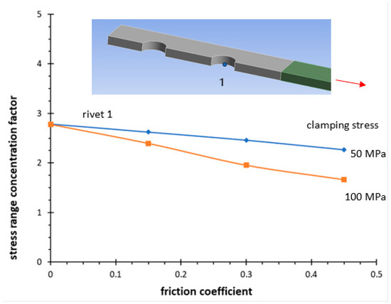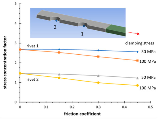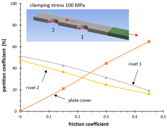 Figure 6 repots a typical result of stress for a tensile stress of 135 MPa in the net section. The longitudinal stress σx is higher at the external rivet, while the contact pressure has a similar trend on the two holes but with a higher average value at the external rivet. In fact, Figure 7 and Figure 8 report the partition coefficient of the forces evaluated for a tensile stress of 135 MPa in the net section. This coefficient is defined as the percentage of the force with respect to that applied in the gross section. The forces are calculated by means of an integral of the FE data. The integral was evaluated for the contact pressure between the shank rivet and the main plate as well as for the shear stress on the surface between the plate and the cover. The friction coefficient and the clamping force strongly influence the distribution of the acting forces on the main plate. Concerning the stress concentration factors of the longitudinal stress σx, Figure 9 shows its trend as a function of the friction coefficient. As the friction force on the contact surface increases, the stress concentration on the two holes decreases.