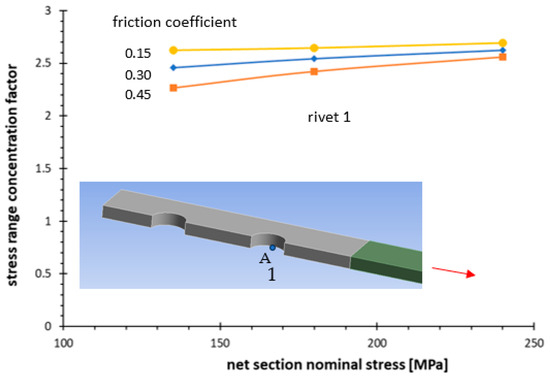 Finally, the non-linear behaviour of the material is considered in Figure 11. An elastic–perfectly plastic material was taken into account with von Mises yield criterion. The nominal stress in the net section is incremented up to the maximum value imposed in the experimental analysis (240 MPa in the net section, see Figure 3). In the case of linear elastic material, the maximum stress range at point A is conditioned by friction force; however, for non-linear material, when the nominal stress increases, the effects of friction are partially removed by the non-linear behaviour of the material. In the unloading phase, a linear elastic behaviour is shown by the material, and the stress range tends to the theoretical value that could be obtained without considering the friction effects. This effect depends on the level of maximum nominal stress in the net section. In other words, the friction influences the stress range to a greater extent at high-cycle fatigue than at low-cycle fatigue.