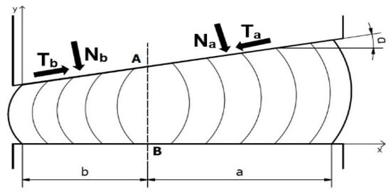 The method elaborated by E.F. Szarapin [,] consists of deforming a flat bar between anvils, of which the lower one is immovable and flat and the upper one upsets the sample into a wedge with the inclination angle of α (Figure 1). Before the test, vertical perpendicular lines should be plotted onto the side surfaces of the flat bar. The lines’ purpose is to determine the location of the neutral plane (A-B). During the test, the vertical lines, under the effect of the friction forces, become curved beyond the A-B line, which divides the material flow into zone a and zone b. The area of the presence of the neutral plane is dependent on the friction force resistances and the inclination value α [].