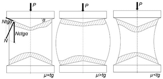 The method developed by E. Siebel and A. Pomp consists of upsetting cylindrical samples between conical anvils in such a way that they maintain a conical shape during the process, through the proper selection of the angle values α in the coned anvil (Figure 2). The core of the method is the selection of the proper cone angle, owing to which a balance of forces can be achieved. During the upsetting of the sample, it may happen that the deformed sample assumes a barrel-like shape, which is a symptom of a too small angle α [].