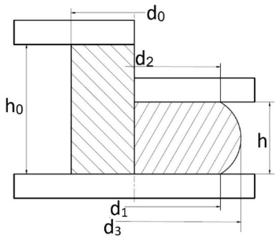 A standard application for the determination of the friction coefficient for short object extrusion processes has been found in the case of the method of the direct–indirect extrusion of cylindrical vessels. In this method, the friction value is determined based on the difference in the height of the upper and lower wall of the extruded vessel []. Diagram of the test and the final shape of the product are presented in Figure 5.