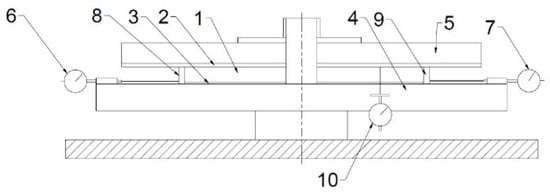 Diagram of a device used in the process of compressing a sample in a cigar test: 1—sample; 2 and 3—acrylic separators; 4 and 5—steel boards; 6 and 7—sample length measurement sensors; 8, 9 and 10—tips of the sample length measurement sensors.