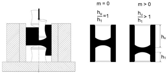 The movement of the upper punch in relation to the immovable container and the lower punch causes the material to flow into the gaps between the container and the punches. In the case of a non-friction process or a very low friction, the lower and upper height of the vessel are the same. An increase in friction causes an increase in the height of the upper wall and a decrease in the height of the lower one. Due to the analogy of the process course and the friction conditions present during the direct–indirect extrusion of real materials, the method enables a comparison of the quality of different lubricants as well as an easy selection of the lubricating mixture for the model experiment [].