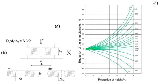 The tests consist of determining the friction coefficient through examinations of samples with the proportions D0:d0:h0 = 6:3:2, where D0—the sample’s external diameter, d0—the sample’s internal diameter, and h0—the sample’s height (Figure 6a).