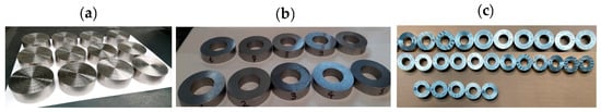 Stainless steel 316Ti is used for the production of forgings constituting elements of silencer clamping rings in motor cars, whereas carburizing steel 16MnCrS5 is applied in the production of connecting rods for petrol sawing machines. The test samples were prepared through a mechanical treatment from round bars with the following dimensions: external diameter—60 mm, internal diameter—30 mm and height—20 mm for stainless steel and external diameter—50 mm, internal diameter—25 mm and height—10 mm for carbon steel (Figure 7), according to the assumptions of the ring test. All samples were made on a Machining Center on a 5-axis Hermle C42U machine. This allowed for an accuracy of ±0.02 mm. In addition, the bases and the internal hole were ground, as these are key features to determine geometric changes.