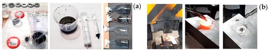 Photographs of (a) the manner of lubricant preparation and (b) the technological trials.
