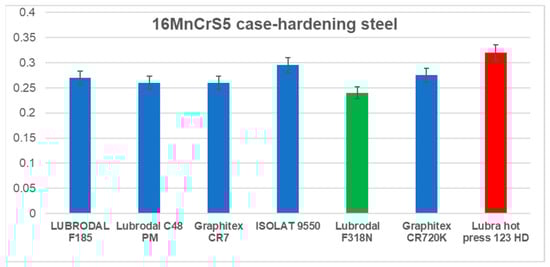 For the carburizing steel samples, the differences in the friction coefficient are insignificant. The highest friction coefficient was achieved for the lubricants Lubra hot press 123HD (µ = 0.32) and and ISOLAT 9550(µ = 0.29), whereas the lowest values were obtained for Lubrodal F318N (µ = 0.24) and Graphitex CR 7 (µ = 0.26).