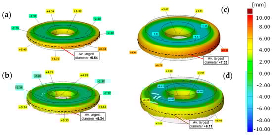 In the case of the ring test (Figure 12a) for which Lubrdal F185 (µ = 0.24) was used as the lubricant, the internal diameter after upsetting decreased from 25.04 mm to the average diameter of 16.4 mm, that is, by about 8.6 mm, which, as shown by the scanning results, is confirmed because inside the ring a material growth from +4.31 to +4.34 mm can be observed. Similarly, in the case of the sample for which the applied lubricating agent was Lubra hot press 123HD (u = 0.33), the internal diameter after upsetting decreased from 25.14 mm to the mean diameter of 15.5 mm, that is, by about 9.64 mm, which is confirmed by the scanning results (an average of +4.82 mm). Similarly, in the case of the results obtained for stainless steel, for the extreme friction coefficient values, for the sample with Graphitex CR 7 (u = 0.19) as the lubricant, the internal diameter after upsetting decreased from 30.03 mm to the average diameter of 22.7 mm, that is, by about 7.34 mm, which is confirmed by the scanning results (an average of +3.7 mm). Also, in the case of the sample (Figure 12d) for which the applied lubricating agent was Lubra hot press 123HD (u = 0.33), the internal diameter after upsetting decreased from 30.04 mm to the average diameter of 20.1 mm, that is, by about 9.64 mm, which is confirmed by the scanning results (an average of +4.97 mm).