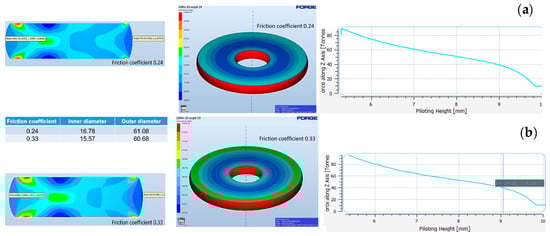 Simulation results with the distributions of deformations, unit pressures and forces during upsetting for carbon steel for the extreme friction coefficient values and the internal and external diameter dimensions for (a) u = 0.24 and (b) u = 0.33.