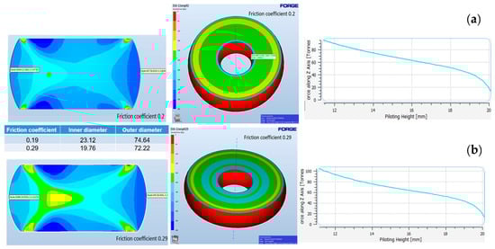 Simulation results with the distributions of deformations, unit pressures and forces during upsetting for stainless steel for the extreme friction coefficient values and the internal and external diameter dimensions for (a) u = 0.2 and (b) u = 0.29.