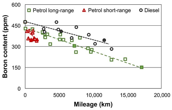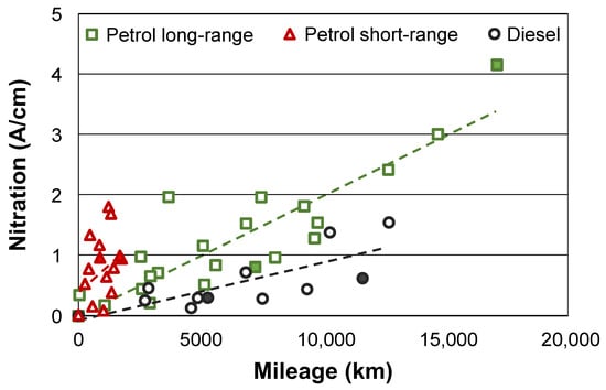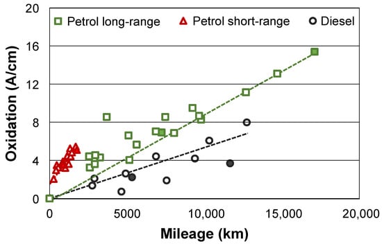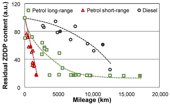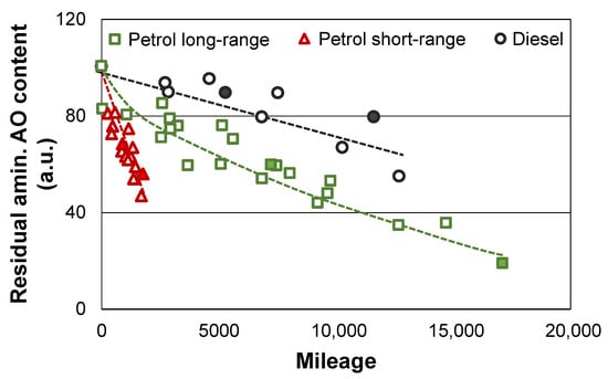 - Agocs, A.; Nagy, A.L.; Tabakov, Z.; Perger, J.; Rohde-Brandenburger, J.; Schandl, M.; Besser, C.; Dörr, N. Comprehensive Assessment of Oil Degradation Patterns in Petrol and Diesel Engines Observed in a Field Test with Passenger Cars—Conventional Oil Analysis and Fuel Dilution. Tribol. Int. 2021, 161, 107079. [Google Scholar] [CrossRef]