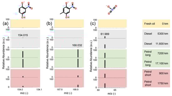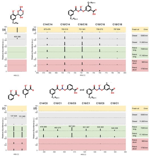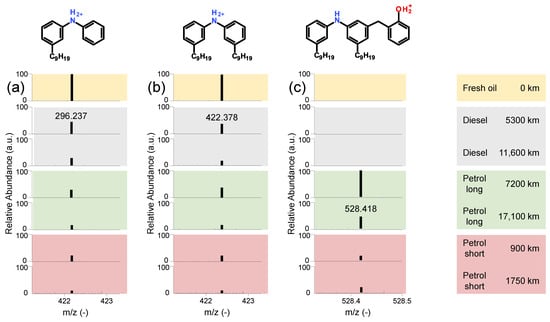- Ramopoulou, L.; Widder, L.; Brenner, J.; Ristic, A.; Allmaier, G. Atmospheric Pressure Matrix-Assisted Laser Desorption/Ionization Mass Spectrometry of Engine Oil Additive Components. Rapid Commun. Mass Spectrom. 2022, 36, e9271. [Google Scholar] [CrossRef]