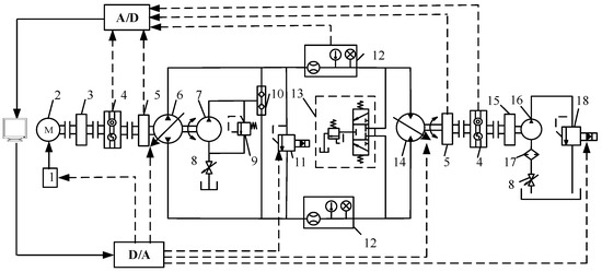 Principle of the hydraulic pump failure test platform. 1—Frequency converter, 2—three-phase asynchronous motor, 3—gearbox, 4—torque and speed sensors, 5—fluted disc, 6—axial piston pump, 7—slippage pump, 8—stop valve, 9—oil replenishment relief valve, 10—oil replenishment one-way valve, 11—pilot proportional relief valve, 12—sensor group, 13—flushing valve block, 14—axial piston motor, 15—inertia wheel and brake, 16—gear pump, 17—filter, and 18—proportional relief valve.