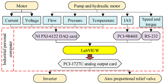The measurement and control principle of the test bench is presented in Figure 6. The monitoring and control system is divided into two parts: monitoring sensors and a control system. The test bench is equipped with motor current, voltage, axial piston pump, hydraulic motor speed, torque, vibration acceleration, system flow rate, pressure, and temperature sensors for the real-time monitoring of dynamic parameters. The signal of the sensor is transmitted to the industrial control computer through the wiring terminal board and data acquisition card for collection, display, and storage, providing various pieces of dynamic information for research into the performance of an electromechanical hydraulic system. The test bench control includes speed regulation and simulated loading. Speed control is achieved for the three-phase asynchronous motors via frequency converters. In the simulation loading test, the voltage control signal of the Atos proportional relief valve is given by the LabVIEW program, and the opening of the valve port is altered so as to modify the system pressure and simulate the actual load. The controlled component is connected to the analog output card PCI-1727U through the ADAM-3937 wiring terminal board.