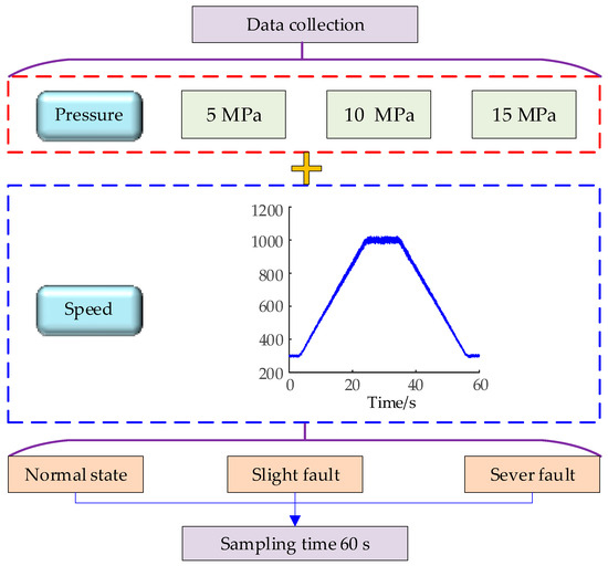 Hydraulic transmission plays an irreplaceable role in the current national defense construction due to its advantages, such as its high load resistance stiffness, flexible configuration, and large power density [1]. The piston pump, as the core power transmission component, is essential to ensuring the safe operation of hydraulic equipment through condition monitoring and fault diagnosis [2]. Hydraulic equipment has multiple energy domain conversions and is commonly used in high-speed and heavy-duty working conditions. This makes the transmission of state information subject to various intricate coupling effects [3]. In particular, some nonlinear factors, such as hydraulic impact, oil film turbulence, and the oil’s volume elastic modulus [4,5], can cause the hydraulic system to exhibit a non-stationary state. Due to the special environment of hydraulic systems, the vibration, noise, and pressure pulsation accompanying their operation are greater than those of ordinary rotating equipment [6,7], resulting in a low signal-to-noise ratio for monitoring status signals and a relatively weak fault feature [8]. This renders it extremely difficult to monitor the operating status of hydraulic components under variable speed conditions. Therefore, it is of great significance to explore innovative fault diagnosis technology for key hydraulic components operating in non-stationary conditions.