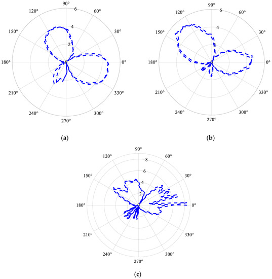 To quantitatively distinguish the degree of wear, the processed IASF waveform was plotted as a polar coordinate graph which can better reflect the relationship between the magnitude and angle of the speed fluctuation. Figure 9 shows polar coordinate diagrams of the reconstructed IASF signals with angle changes under normal, weak wear, and severe wear conditions.