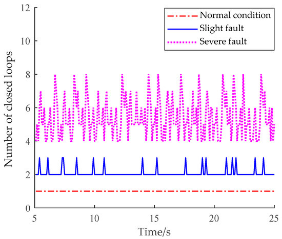 From Figure 10, it can be noted that under normal operating conditions, the number of closed loops in the 180°~270° range is always one. After the fault occurs, the number is greater than or equal to two. Therefore, a threshold of two can be set to achieve the diagnosis of piston pump valve plate faults.