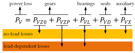As described by Höhn et al. [16], as well as several other researchers [17,18,19,20], the total power loss in a gearbox is the sum of gear ( and ), bearing (), seal (), and auxiliary () losses, as presented in Figure 1.