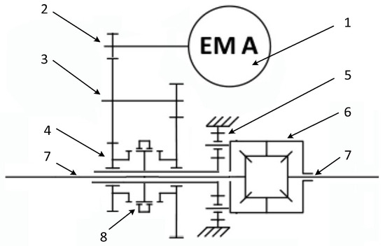 Sketch diagram of the E-Axle. 1—electric motor; 2—first shaft; 3—second shaft; 4—third shaft; 5—planetary; 6—differential; 7—output shafts; 8—shift mechanism.