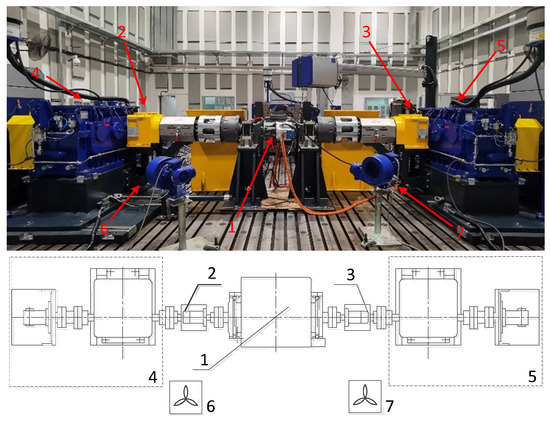 Durability and performance test bench of the E-Axle. 1—E-Axle; 2,3—torque and speed sensors; 4,5—loading motor and gearbox; 6,7—cooling fan.