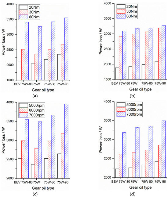Power losses for the tested oils. (a) 50 °C, average of speed cases; (b) 80 °C, average of speed cases; (c) 50 °C, average of torque cases; (d) 80 °C, average of torque cases.
