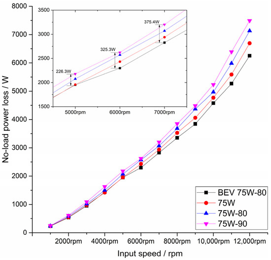 Regarding the no-load power loss, the BEV 75W-80 oil exhibited almost the lowest power loss while the 75W-90 oil had a much higher no-load power loss than the others. The 75W-90 oil had the highest kinematic viscosity and density, so whether from the perspective of overcoming the fluid viscous resistance or accelerating a larger mass of oil, more energy must be used in this process. Therefore, it should be believed that these differences should result from churning power loss. From the local enlarged image, it can be seen that the difference between selected oil types became larger as the speed increased. For an electric gearbox with high input speed, controlling the churning power loss can bring considerable benefits.