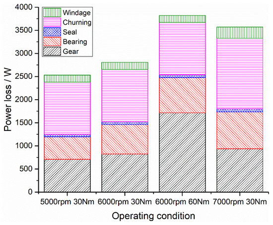 - The calculated results show that at the nominal operating conditions of the light-duty truck, churning is the most significant power loss source, accounting for more than 40%. The highest proportion is due to its high input speed and deeper immersion depth. The gears are the second most important power loss source, with a similar proportion attributed to the bearings.