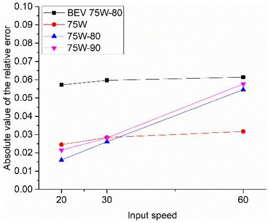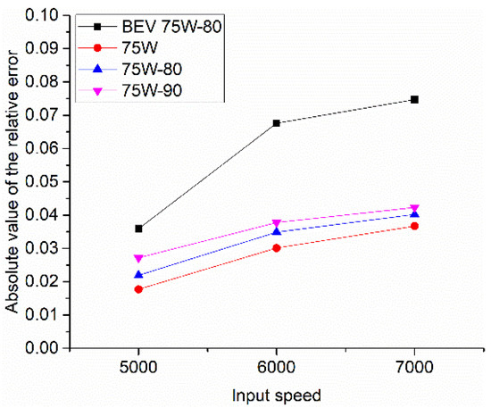 The absolute value of the relative error between each selected gear oil at different input speeds and input torques is shown in Figure 10 and Figure 11, respectively.