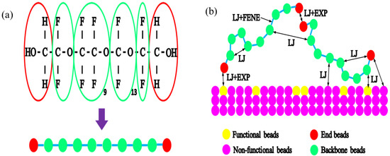 The conventional lubricant PFPE was coated on the diamond-like carbon (DLC) overcoat of the disk surface due to its excellent qualities, such as corrosion protection and wear minimization [28,29]. The Fomblin lubricant with polar hydroxyl groups of PFPE had good thermal and chemical stability performance and hydrophobicity and the desirable property of lubricity [30,31]. As shown in Figure 1a, the Fomblin Zdol-type lubricant had the following copolymer structure: , where represents the functional beads with hydroxyl groups () and . On the disk surface, the PFPE lubricant molecules existed in two distinct states: bonded lubricant molecules and mobile lubricant molecules. Due to the complexity of the simulation system using the all-atom model and joint atom model of lubricant molecules, this limited the number of lubricant molecules. Therefore, this study adopted a coarse-grained model to study the relevant characteristics of lubricant molecules. For complex structured compounds, coarse-grained models can more effectively simulate macromolecular polymers, simplify system force field parameters, and have the advantage of extending the simulation time.