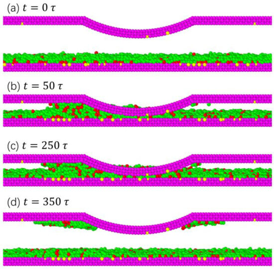 Figure 5 shows the lubricant transfer during the slider/disk contact process. As shown in Figure 5b, after the slider reached the specified height, due to the various forces (air bearing pressure, thermodynamics, and van der Waals forces) and relative motion states between the slider and disk, the lubricant gradually accumulated near the cylindrical asperity area at the left end of the slider. Because of the small distance in the interface space, over time, the accumulated lubricant molecules formed a bridge between the disk and the slider surface. When the stacking height increased to the range of atomic action on the slider surface, the accumulated lubricant molecules were transferred to the slider surface under van der Waals forces. After the slider–disk stably ran , the lubricant molecules on the disk surface began to migrate, as shown in Figure 5c. After , the stable operation phase ended and the slider returned to its initial position. Throughout the entire upward process, the strong molecular forces on the slider surface attracted lubricant molecules to the slider and rose together with them, as shown in Figure 5d.