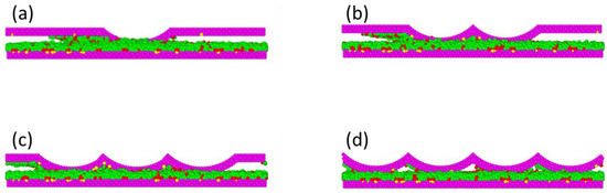 According to the analysis of the lubricant loss resulting from the asperity shape of the slider, it can be concluded that the cylindrical asperity slider can effectively reduce friction loss under low load impact. Therefore, further exploration of the influence of parameter changes in cylindrical asperity sliders on friction losses will be carried out. In order to study the effect of the asperity amount on the depletion volume of the lubricant, different amounts of cylindrical asperity were formulated and are shown in Figure 6. The number of asperities on the slider varied from one to four. All of the sliders had the same dimensions, with a length of and a width of .